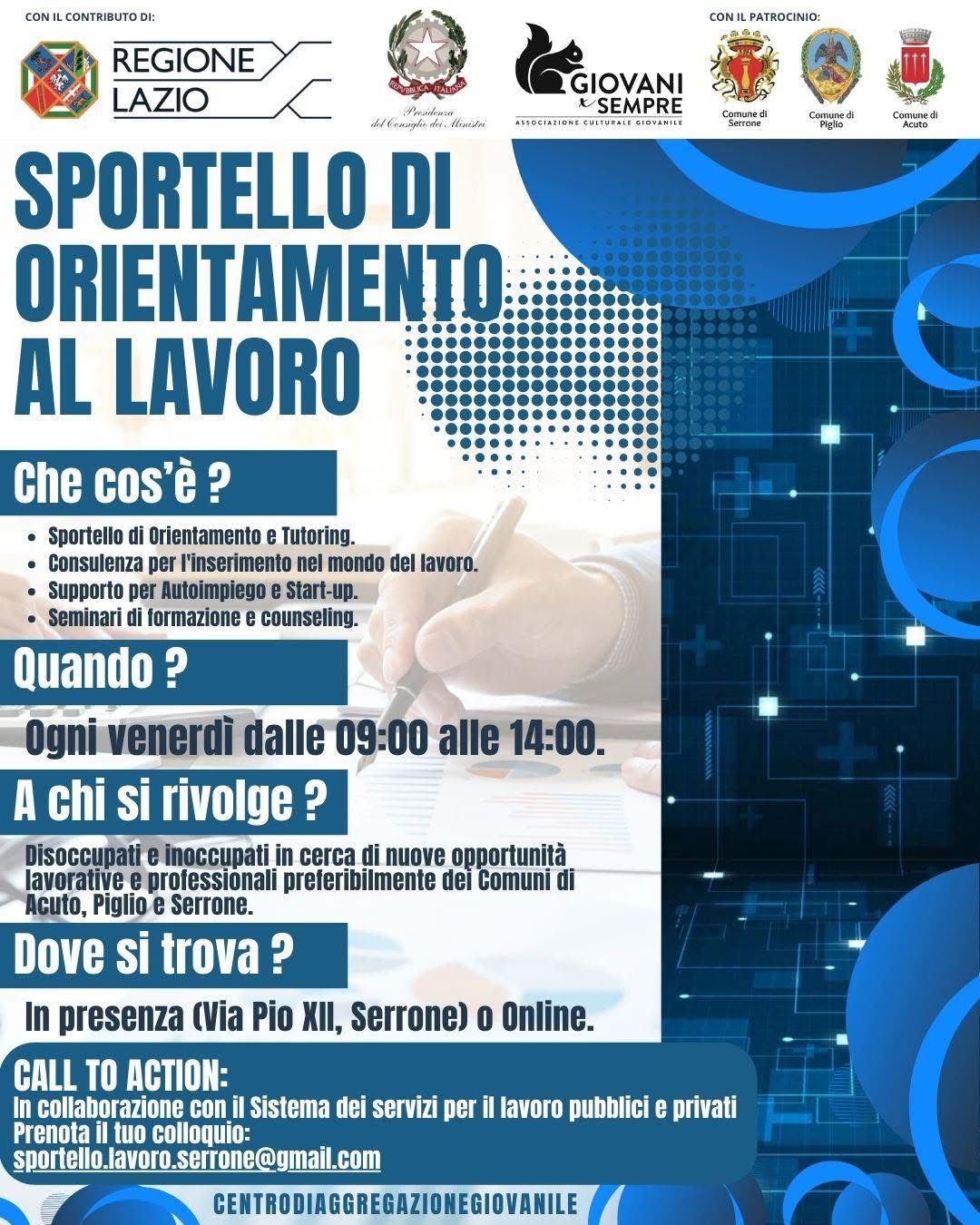 Si informa la cittadinanza che è attivo lo Sportello di Orientamento al Lavoro, un servizio di orientamento e tutoring rivolto a persone disoccupate e inoccupate in cerca di nuove opportunità lavorative e professionali, con particolare riferimento ai residenti nei Comuni di Acuto, Piglio e Serrone.